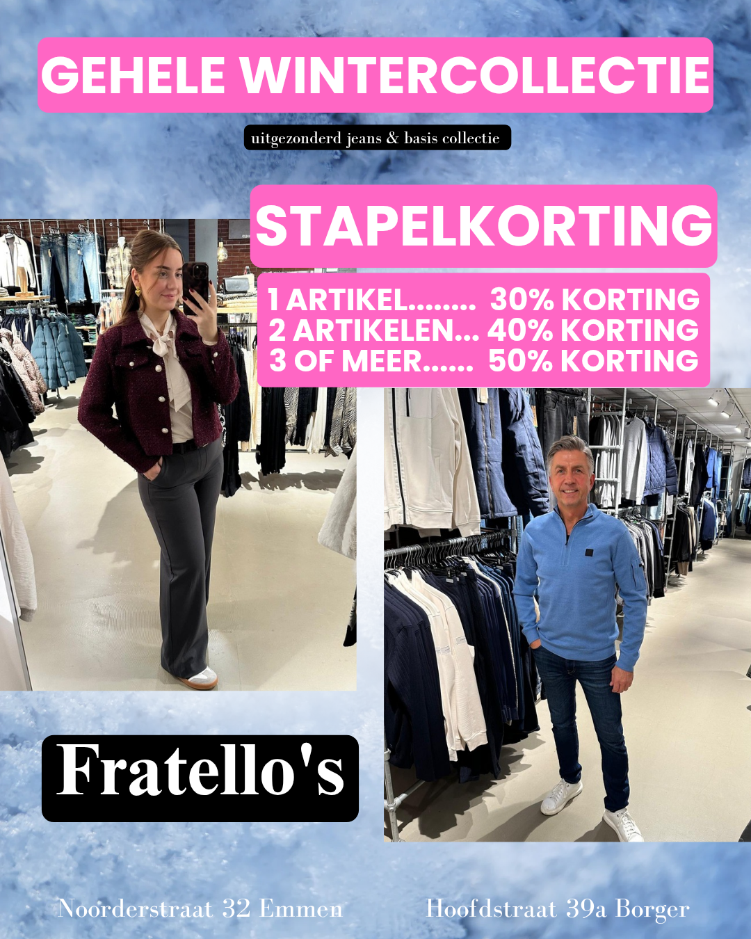 Fratello's heeft een wekelijks wisselende collectie voor zowel de dames als de heren. Fratello's zit er steevast bovenop om de meest trendy kleding binnen de kortste keren naar Emmen en Borger te halen. Daardoor stellen we onze klandizie in de gelegenheid steeds weer nieuwe combinaties te maken. Dat vaste aanbod van de meest actuele modetrends, combineren we ook nog eens met betaalbare, zelfs scherpe prijzen. Ander speerpunt is de klantvriendelijkheid. Die wordt optimaal gerealiseerd door onze vakkundige verkoopsters, u wordt in een sfeervolle ambiance op een gemoedelijke wijze wegwijs gemaakt en geadviseerd.